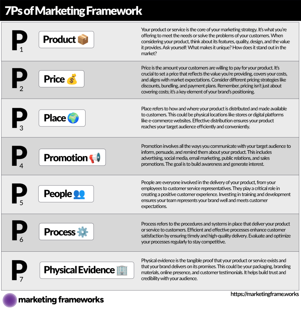 This framework encourages marketers to think beyond just the product and how it’s sold. It ensures they consider pricing strategies, distribution channels, promotional tactics, the people delivering the experience, operational processes, and the tangible cues that reinforce brand trust. When applied together, the 7Ps help build a cohesive and effective marketing strategy that supports customer satisfaction and business growth.
