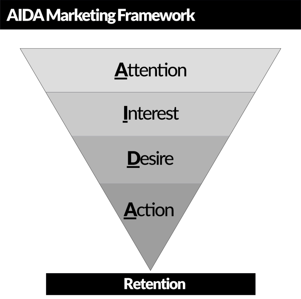 The AIDA model is a marketing framework that outlines the psychological journey a customer takes when interacting with a brand or product: Attention, Interest, Desire, and Action. It’s commonly visualized as a funnel, guiding prospects from first exposure down to conversion.