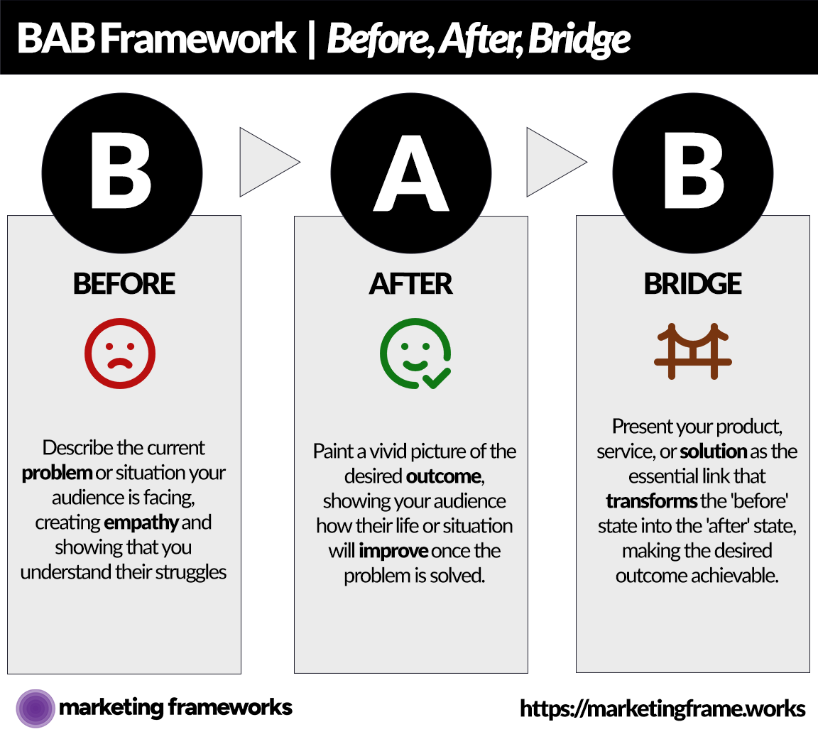 The BAB Framework—short for Before, After, Bridge—is a simple yet powerful storytelling structure used in persuasive writing and marketing. It begins by describing the Before state: the current struggle, pain point, or problem your audience is facing. This step builds empathy and helps the audience feel seen and understood.
