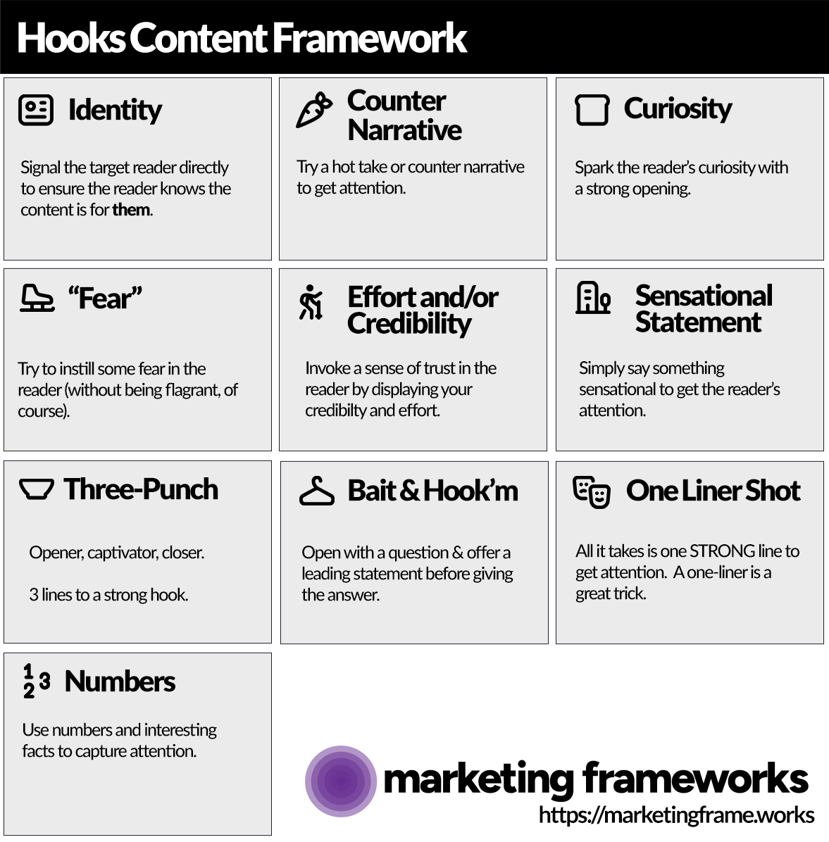 Whether you’re using a bold statement, posing a question, invoking urgency, or signaling that the content is “for someone like you,” the framework offers multiple ways to engage different audiences. From one-liners and three-punch setups to data-driven or emotionally charged openings, these techniques give your content the initial spark it needs to win attention—and earn the right to be read, watched, or clicked.