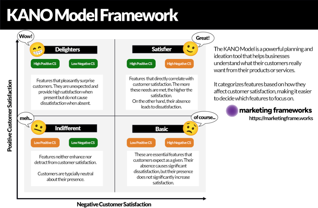 By understanding which features drive delight versus which simply meet baseline expectations, businesses can make smarter design, development, and marketing decisions. The Kano Model is especially useful during product planning and iteration, as it ensures you focus on what truly matters to your customers—not just what’s easy to build or commonly assumed to be valuable.