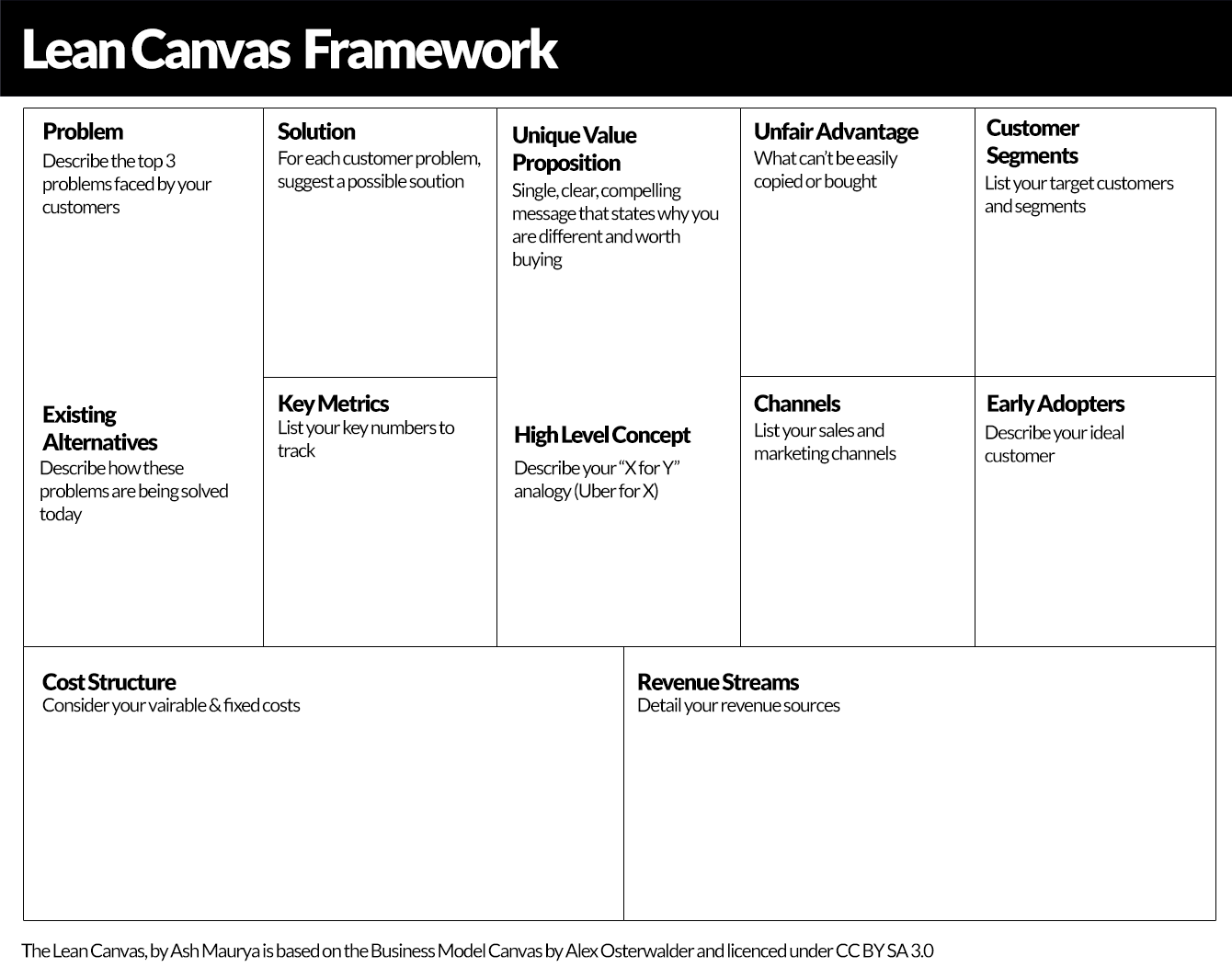 Take a look at the blank/explanatory template for the Lean Canvas Framework.