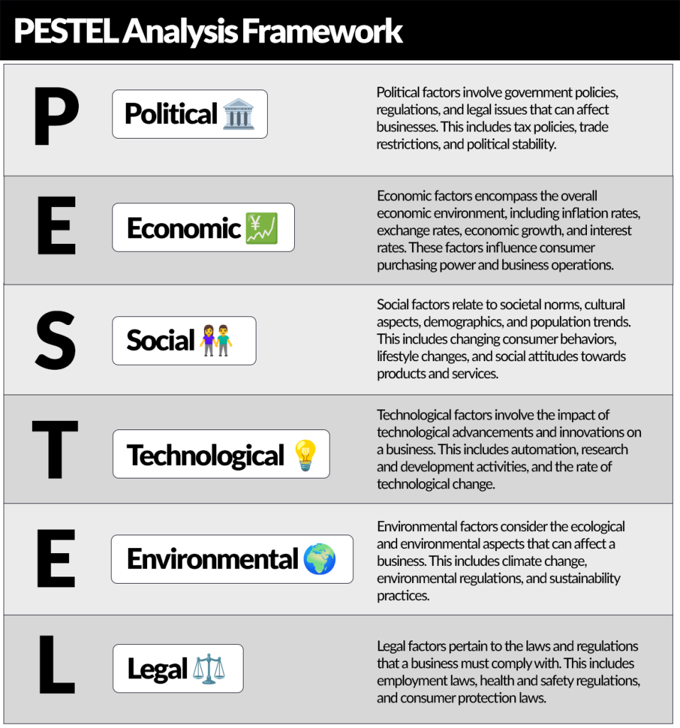 The PESTEL Analysis Framework is a strategic planning tool used to assess the external factors that could impact a business or market. It breaks down six key areas of influence: Political, Economic, Social, Technological, Environmental, and Legal. Each factor helps organizations understand the broader landscape they operate in, from government policy and economic trends to cultural shifts and legal regulations.