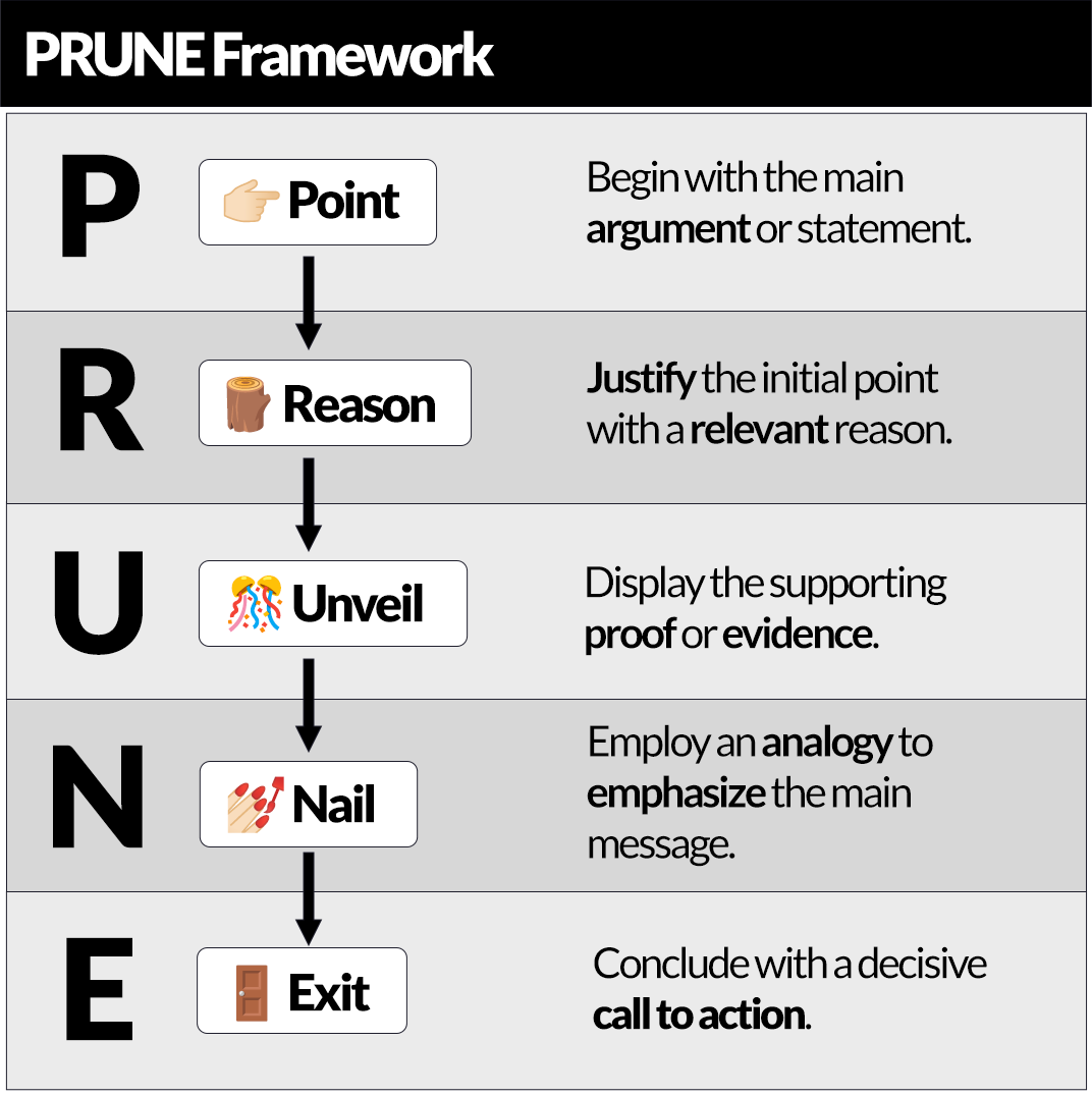 The PRUNE Framework is a structured messaging technique that helps you communicate persuasively and clearly—especially in written or spoken content. It starts with your Point, the main idea or argument you want to get across. You then back that up with a Reason, giving your audience a logical justification to believe or care about what you’re saying.